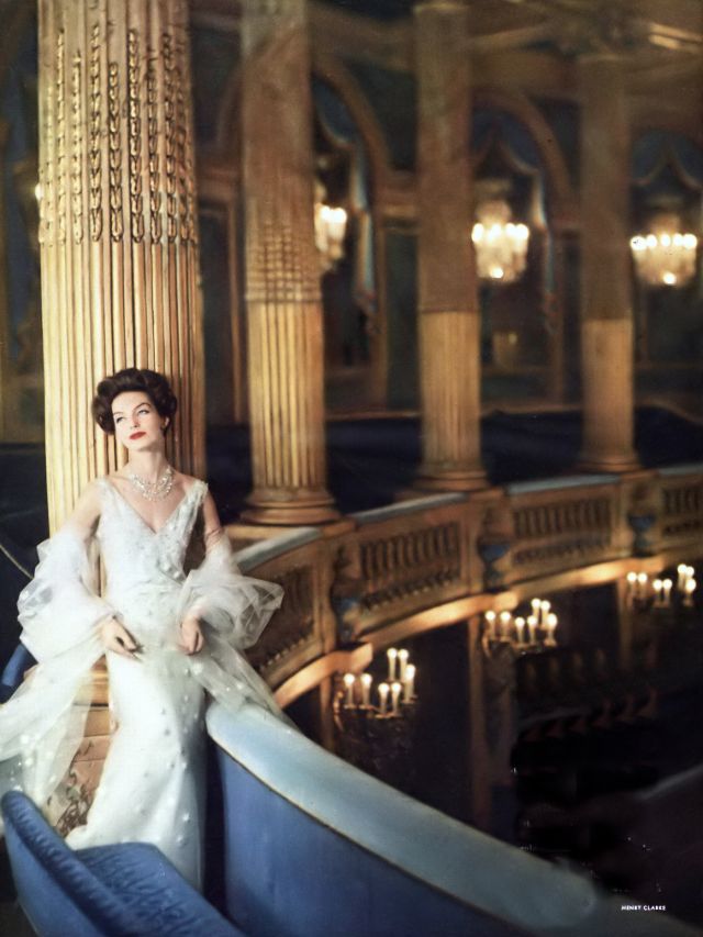 | Joanna McCormick in diaphanous white nylon tulle gown with milk-white spangles and floating stole by Dior, photo by Henry Clarke at the Royal Opera House at Versailles, Vogue, April 15, 1957 |
