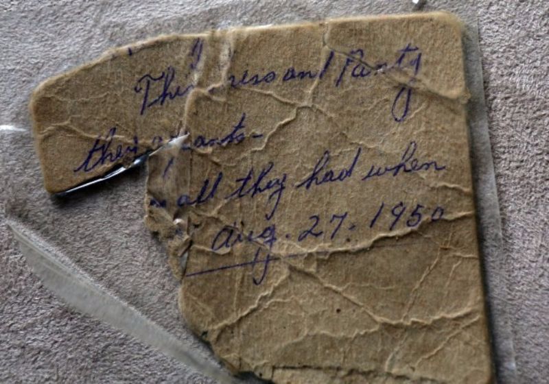 | A note sent with RaeAnn Mills when she was sold that describes her belongings, which was only the clothes she was wearing. |