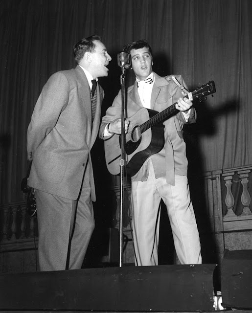 | Legendary disc jockey Dewey Phillips joined Elvis on stage at Ellis Auditorium on Feb. 6, 1955. When Phillips first played Elvis' song "That's All Right" on the radio, the phone lines jammed with callers wanting to hear more. (Robert W. Dye / Elvis Presley Enterprises Inc.) |