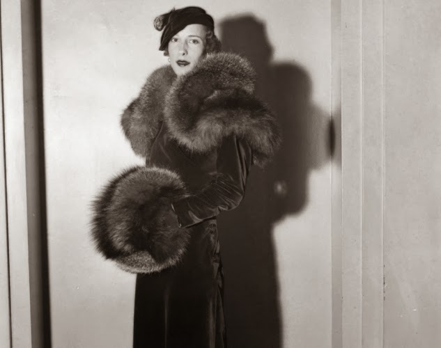 | Model Jean Early poses on the staircase at a 1934 summer fashion show while completely decked out in an elegant suit with a fur cape and hat. |