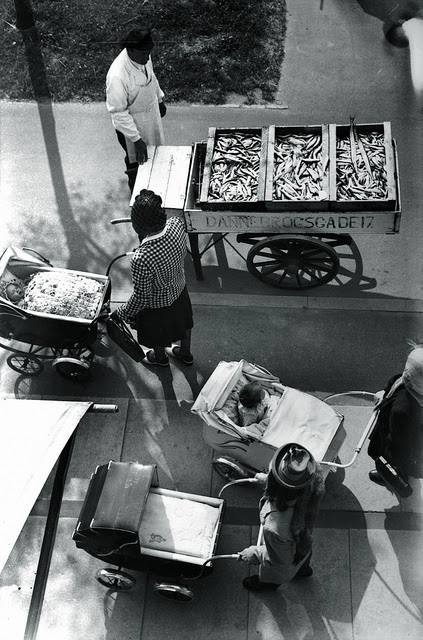 | Sales man with barrow and women with prams. Near Århus Station. |