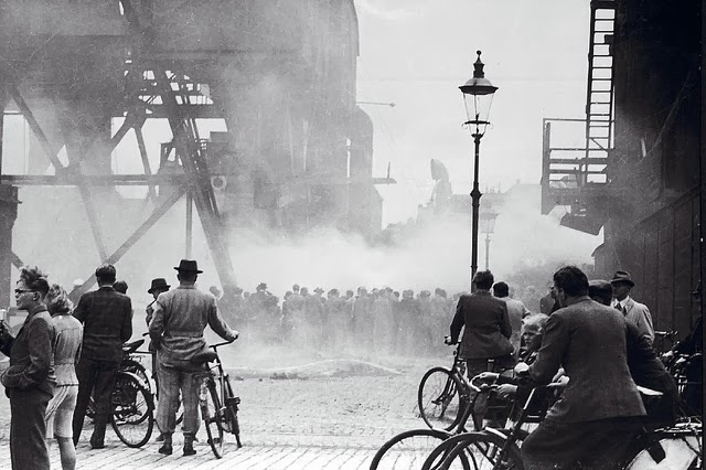 | Cyclist looking at the burning Shellhouse (Getapo's head quarter) after the RAF attack.. 18th April 1944. |