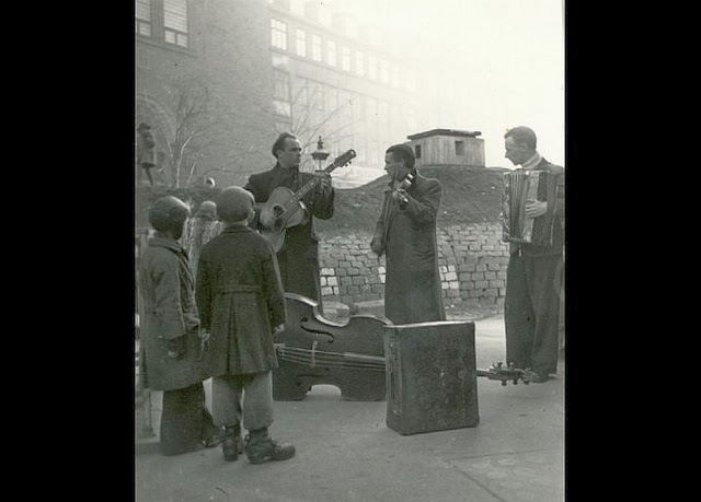 | Musicians in the streets of Vesterbro, Copenhagen, March 1945. |