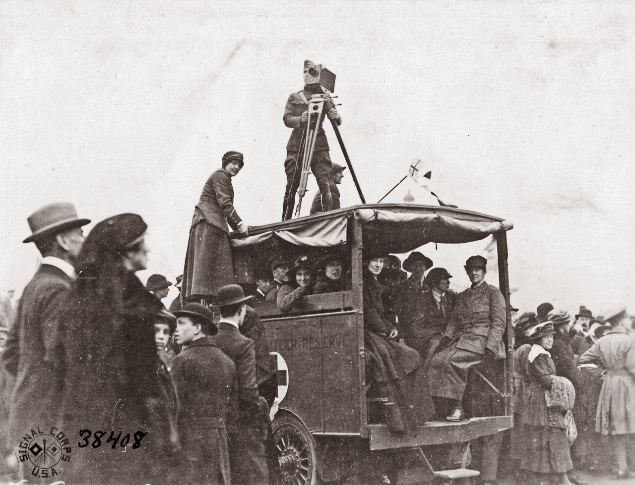 | Lt. Sintzenich on roof of ambulance making moving pictures of crowd outside of Buckingham Palace celebrating signing of Armistice. |