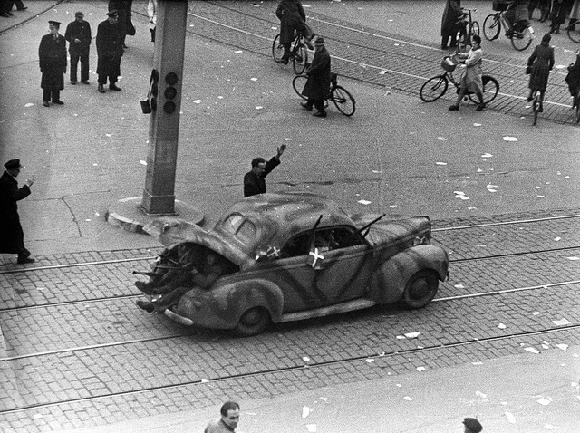 | Freedom fighters in a German car at The Central Square (Rådhuspladsen) in Copenhagen. 5th May 1945. |