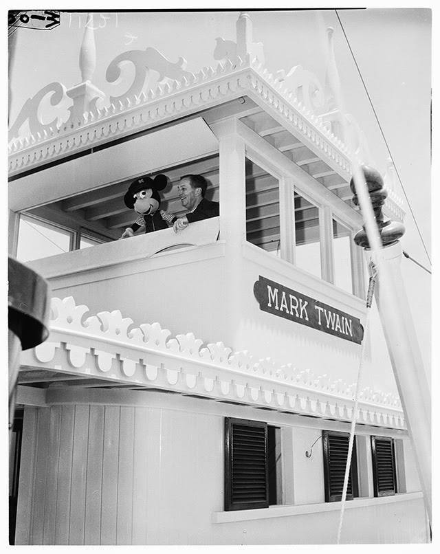 | Walt Disney and Mickey Mouse piloting the Mark Twain Riverboat |