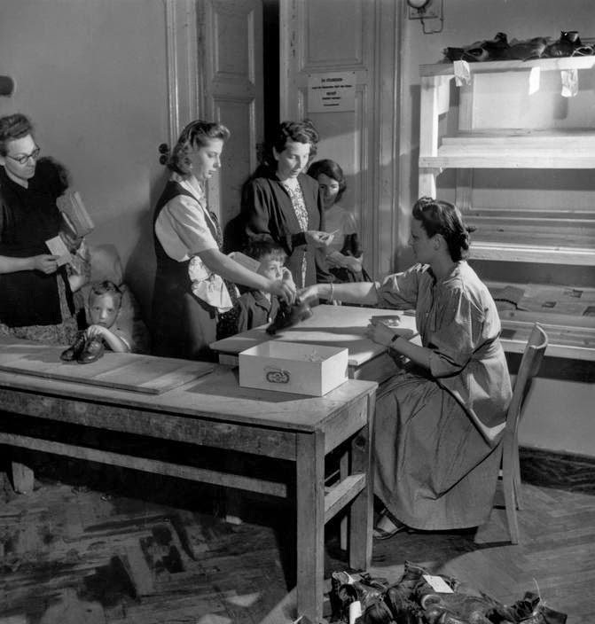 | AUSTRIA. Vienna. 1948. The shortage of shoe leather is acute and in many families the same shoes are worn alternatively by different children. |