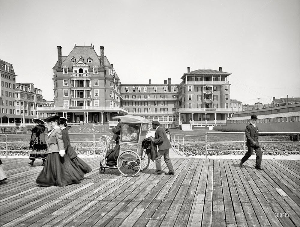 | The Jersey shore circa 1906. Rolling chairs on the Boardwalk, Atlantic City. Hotel Traymore in the background. |