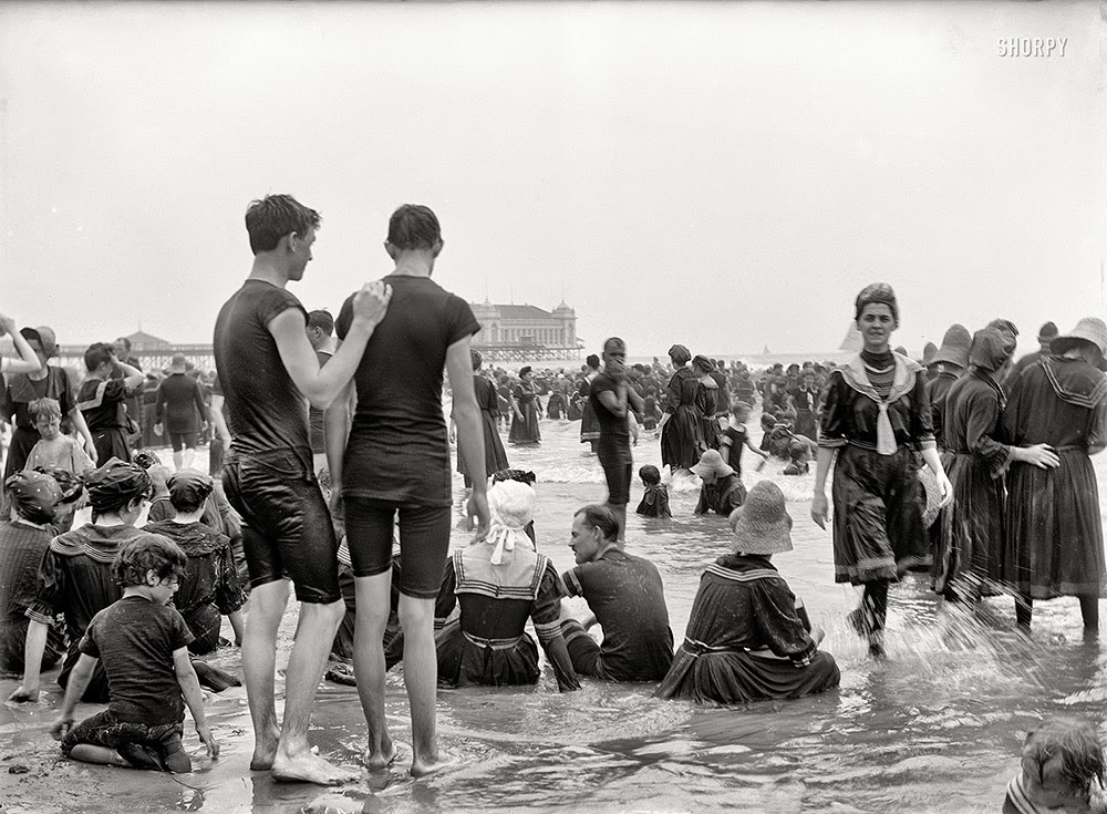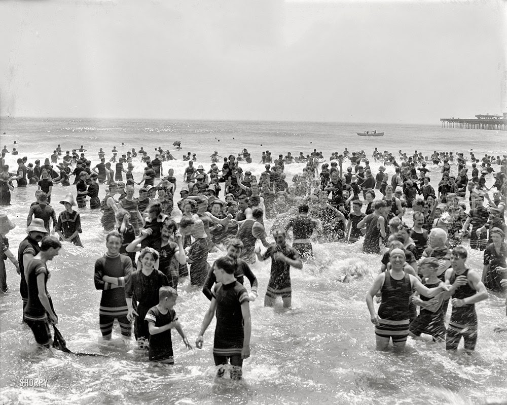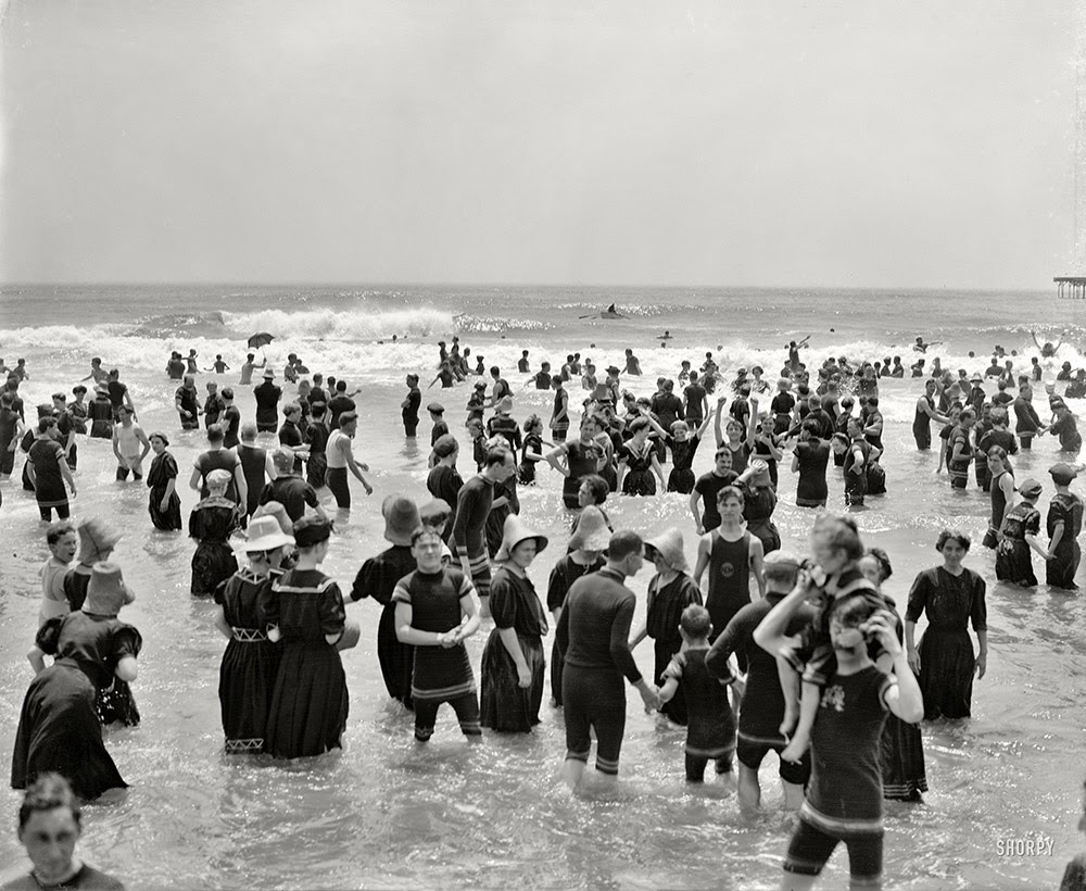 | The Jersey Shore circa 1910. Bathers at Atlantic City. Many of them gamely striking a pose for the camera as they peer into the existential void. |