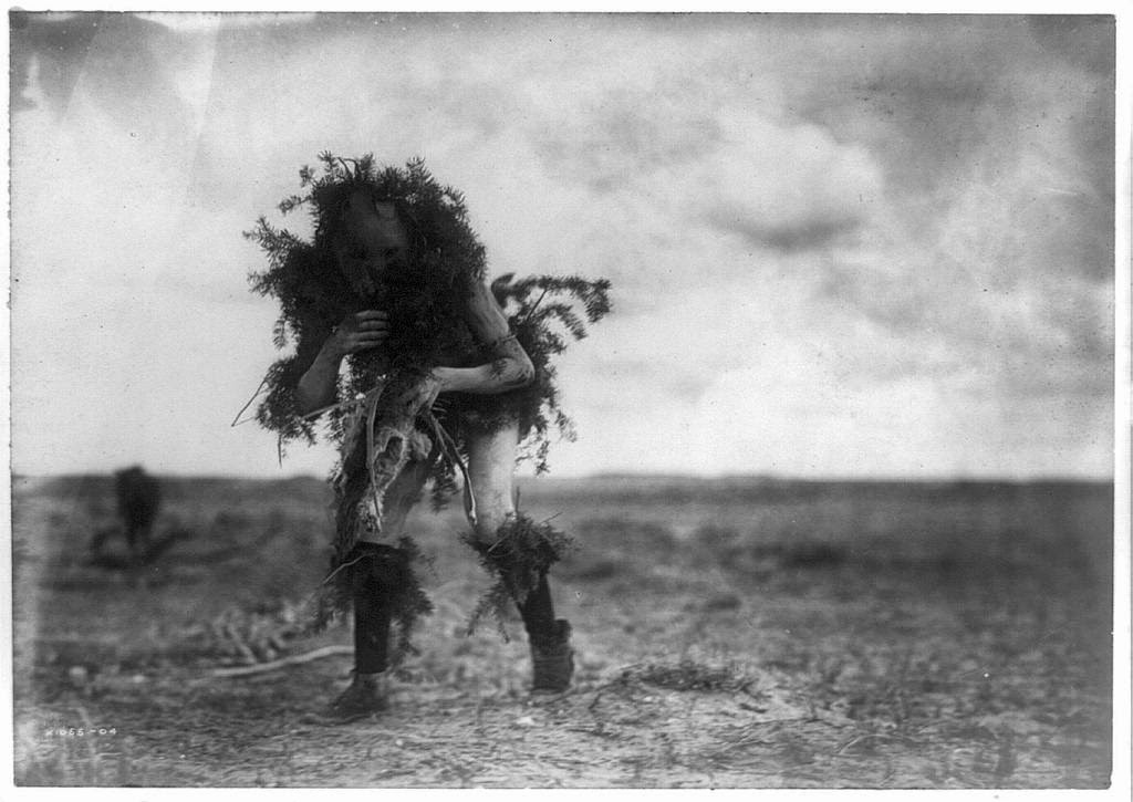 | Yebichai, the beggar, Tonenili-Navajo Indian, dressed in spruce branches. |