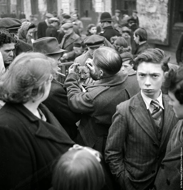 | A soldier examines a puppy on sale at Club Row market in Londons East End, a street famed for its dog sellers. January 1946. (Photo by George Konig/Keystone Features/Getty Images) |