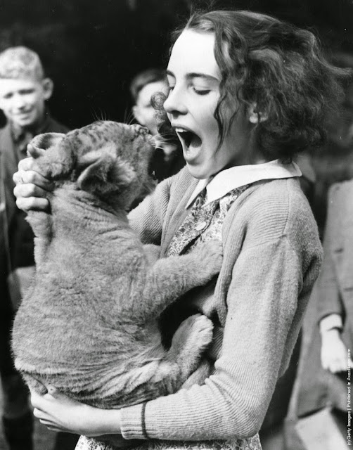 | June Mottershead mimics her newly adopted lion cub at Chester Zoo in Cheshire. The lion has been adopted to save it from destruction because of lack of zoo funds. 30th September 1939. (Photo by Fox Photos/Getty Images) |