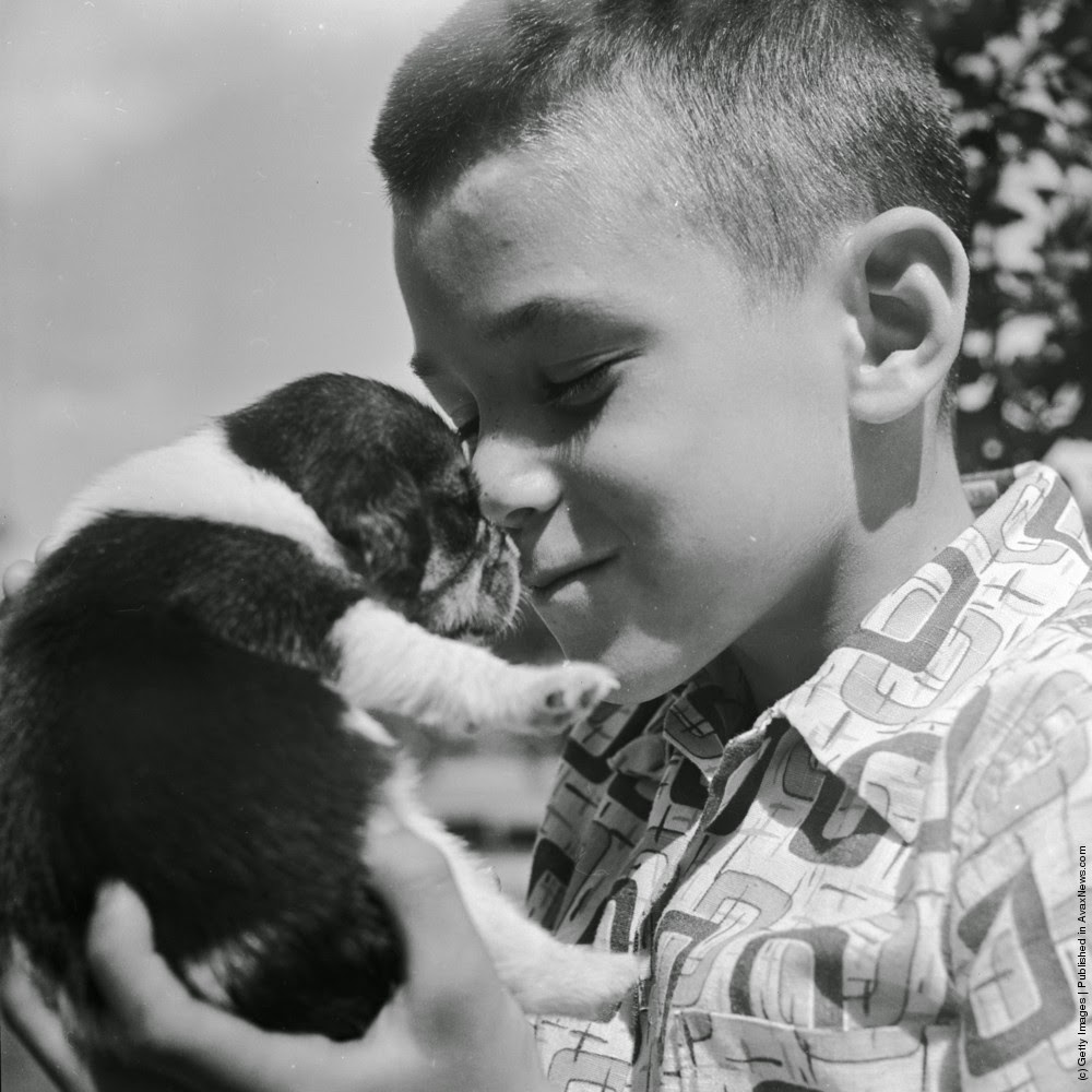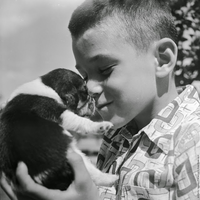 | A boy gives love to a pet beagle puppy. Circa 1950. (Photo by Orlando /Three Lions/Getty Images) |