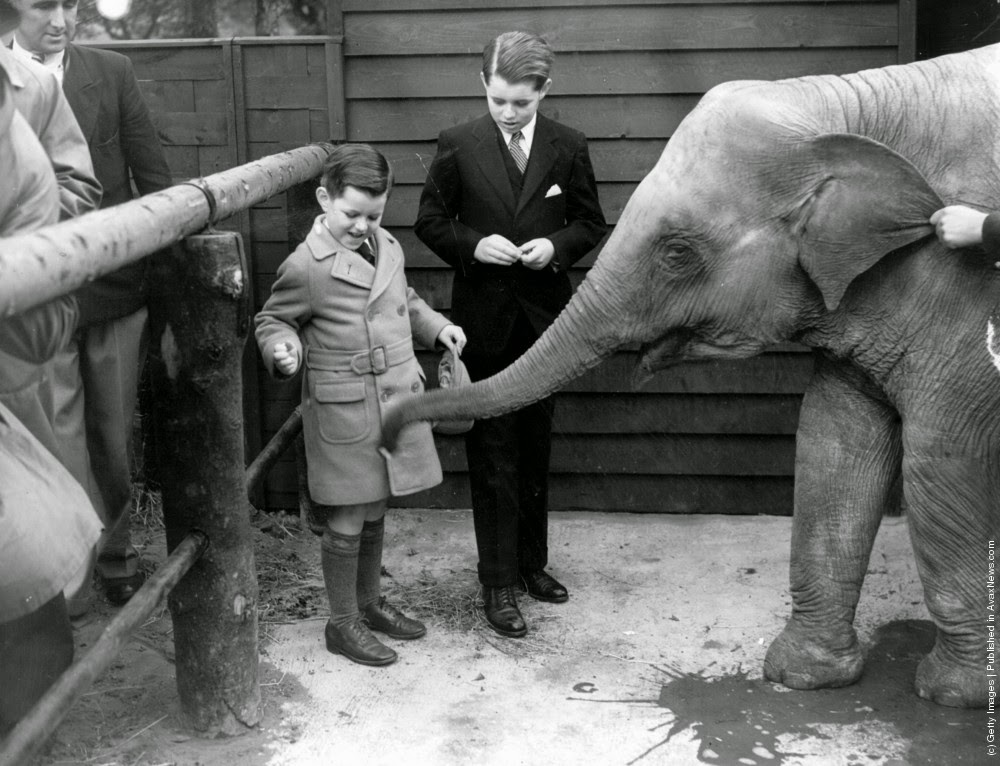 | Edward Moore Kennedy, the youngest son of Joseph Patrick Kennedy is pictured aged 6 years with his brother Robert Francis Kennedy (1925–1968) giving sugar to [Babar] the baby elephant at the childrens zoo within Regents Park Zoo. June 1938. (Photo by Hulton Archive/Getty Images) |