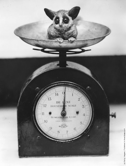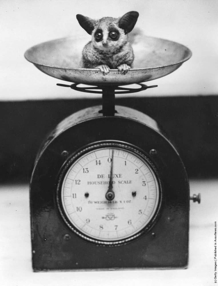 | A baby bush-baby in a set of scales at London Zoo shortly after birth. 10th August 1938. (Photo by Fox Photos/Getty Images) |