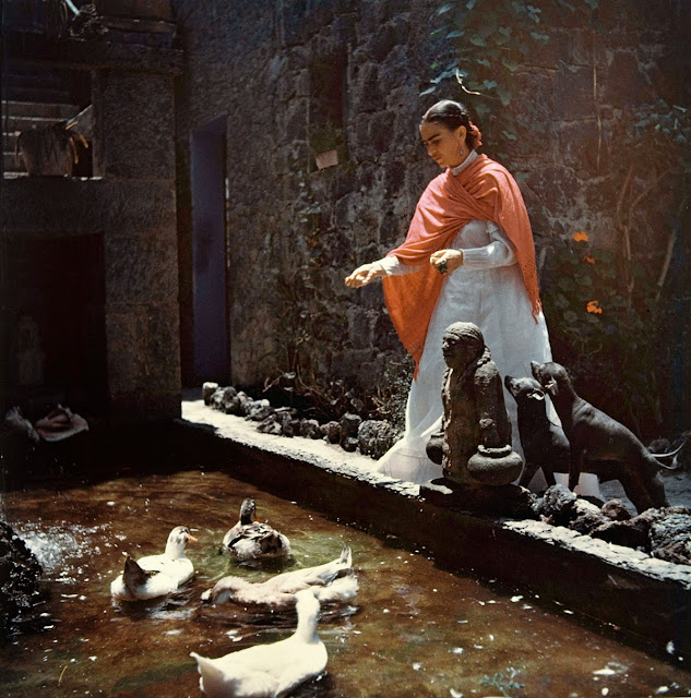 | Frida Kahlo in front of the ornamental pool in her garden, 1951—Photo: © IMEC / Fonds MCC / Dist. Rmn / Photo Gisèle Freund |