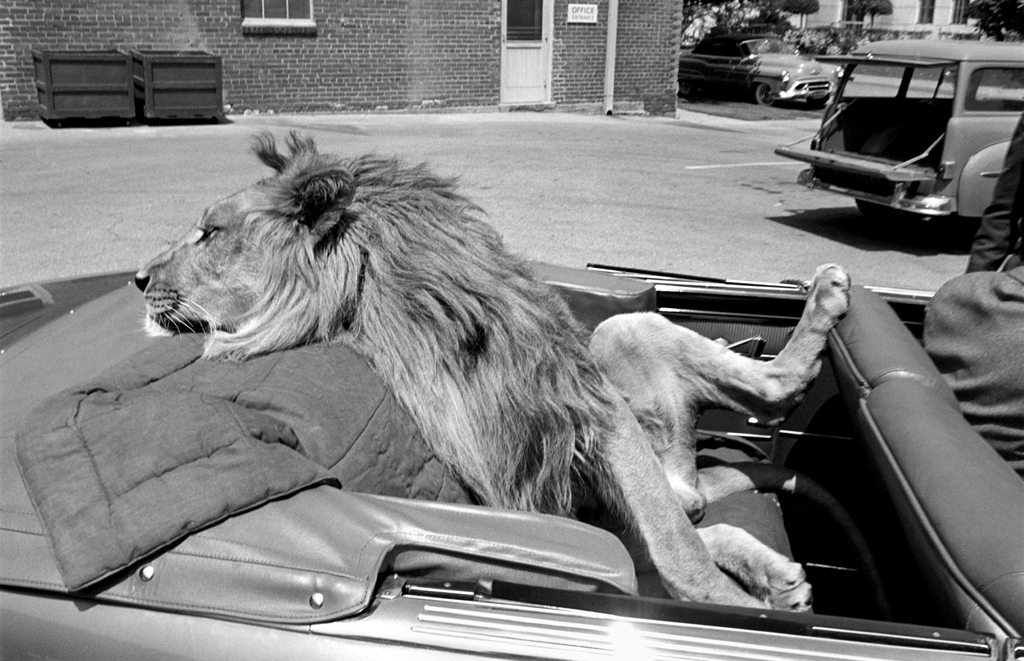 | A photographer shoots publicity photos of Fagan the lion, 1951. |