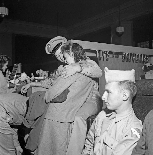| Private D.N. Danielson, stationed in North Carolina, and Mrs. Danielson, from Minnesota, in the waiting room of the Greyhound bus terminal. They met in Chicago to save time for his furlough. |