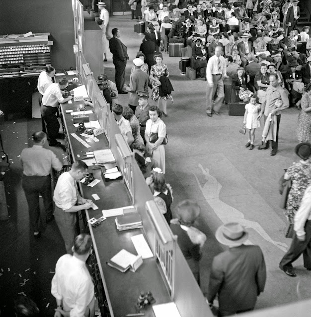 | Waiting for the bus at Chattanooga Greyhound terminal, 1943. |