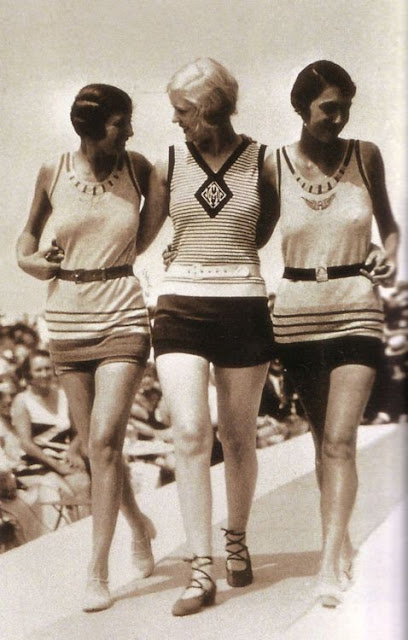 1928 - Three women participate in a beach fashion show in the roaring 20s.