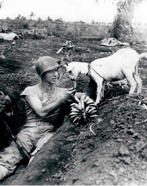 1944 - Soldier on Saipan in the Mariana Islands in World War II shares a banana with a goat during battle.