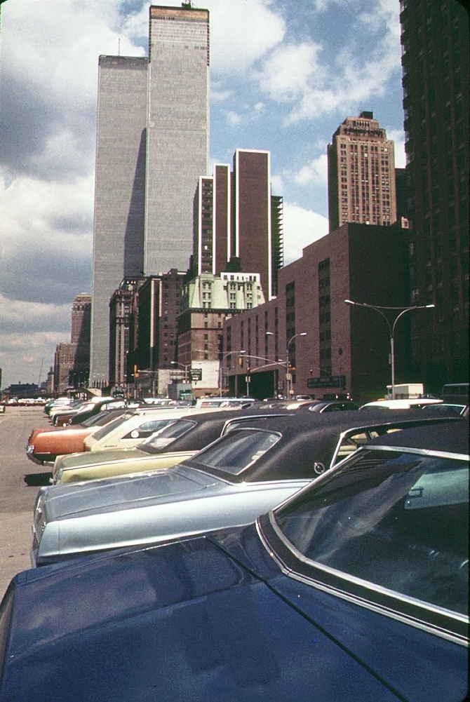 | World Trade Center with lots of colorful 1970s cars by West Street, New York, June 1973 |