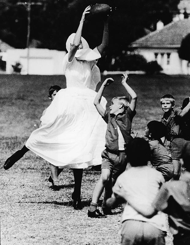 | Sister Marie Louise used her height advantage during this 1950s game of rugby. |