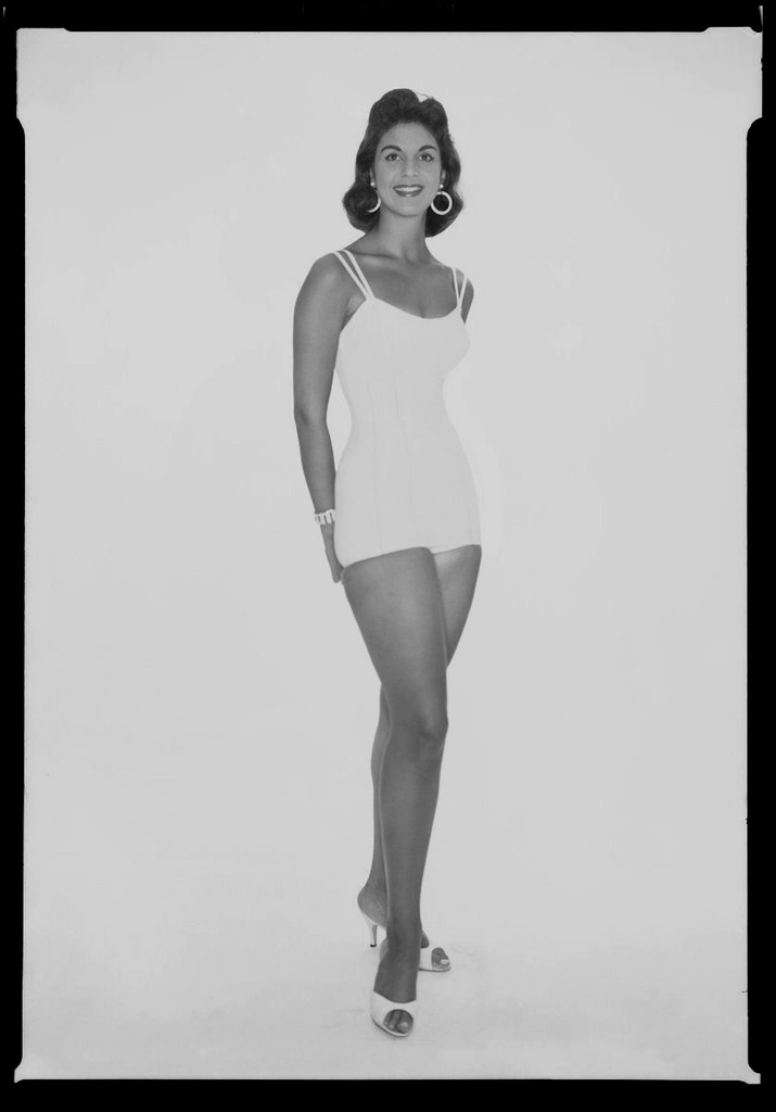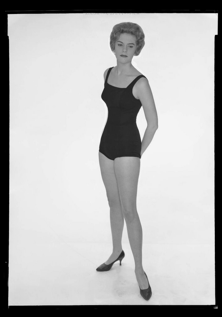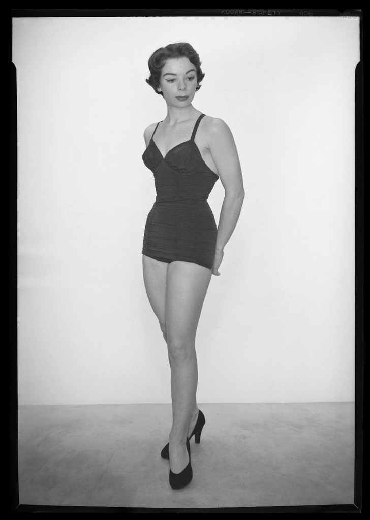 The bathing suit of the 1950s was a classic sheath. The top usually had a sweetheart neckline with a very tight, short skirt covering the front part of the bottom (sometimes this extended to the back as well). Wearing a swimsuit didn’t get women off the hook from maintaining that perfect ‘50s figure either. The top had padded or formed cups to enhance the bust, and the rest was fitted and boned like a corset. Rouching was used a lot on either the sides of the suit or down a panel on the front. This fabric trick created an optical illusion, hiding fifties bathing suitsunsightly rolls and making the bathing beauty look slim. Some suits zipped up the back so that they could be extra form-fitting (or extra form-enhancing).