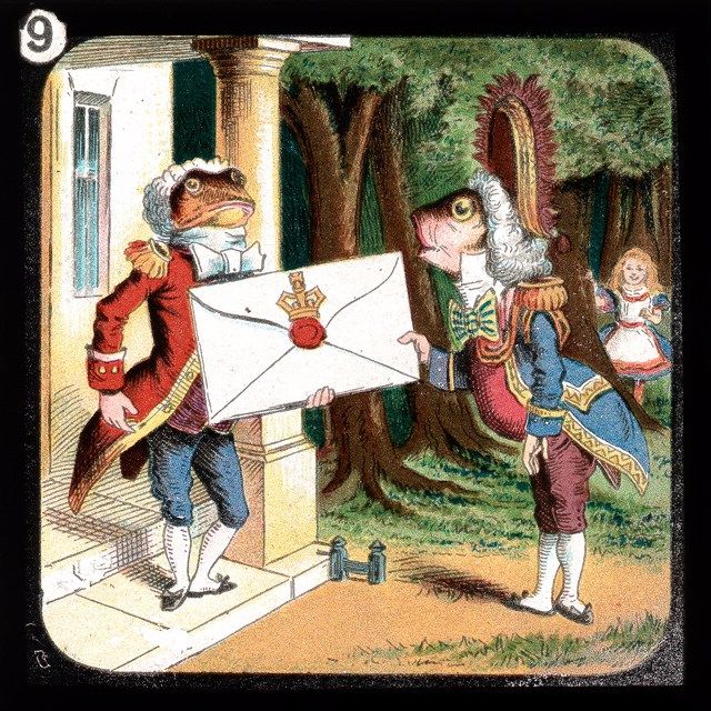 Created as a set of 24 slides based on Sir John Tenniel’s original illustrations for the Lewis Carroll classic but altered to avoid copyright conflicts, these gems were meant for viewing on a magic lantern, or Laterna Magica — a primitive projector dating back to the 17th century, consisting of a concave mirror in front of a light source. Though the exact year is unknown, the slides were created sometime between 1910 and 1925.