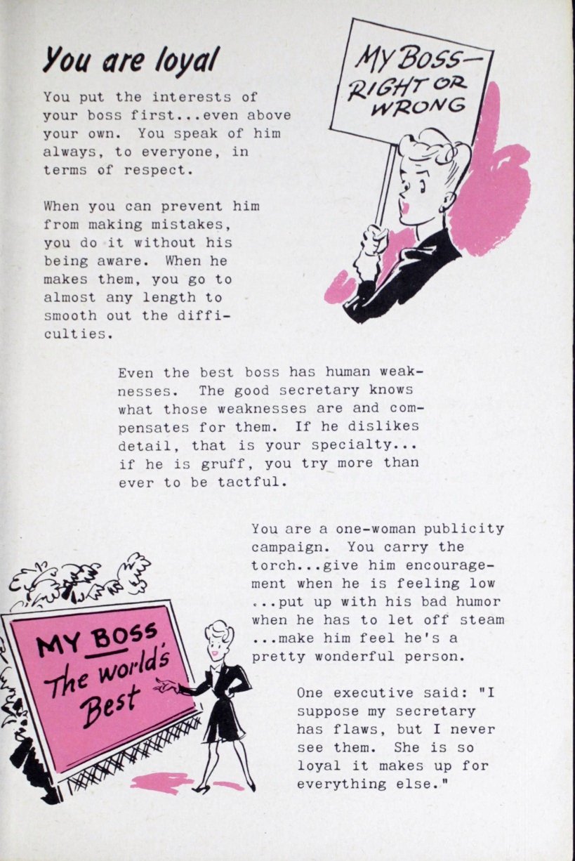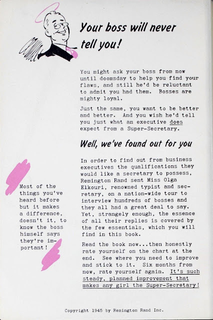 Titled Memo: How To Be A Super Secretary, this booklet showcases the work of Miss Olga Elkouri, "renowned typist and secretary," who embarked on a nationwide tour to find out which qualities bosses seek in secretaries. Miss Elkouri's findings are summed up within the pamphlet, which also features a plug for the Betty Grable film, The Shocking Miss Pilgrim, on its cover.