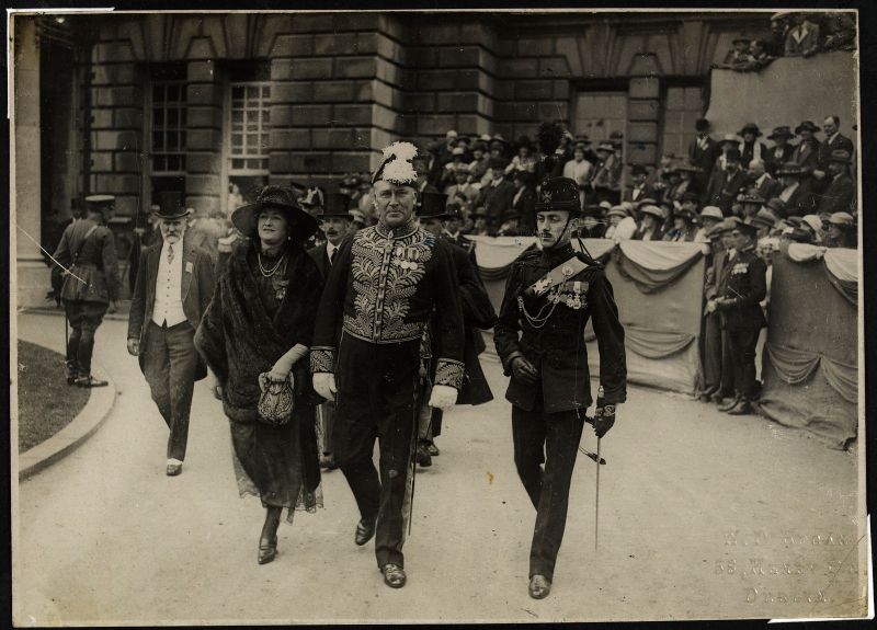 | Sir Hamar and Lady Margery Greenwood arriving for the opening of the Ulster parliament, Belfast, 22 June 1921 |