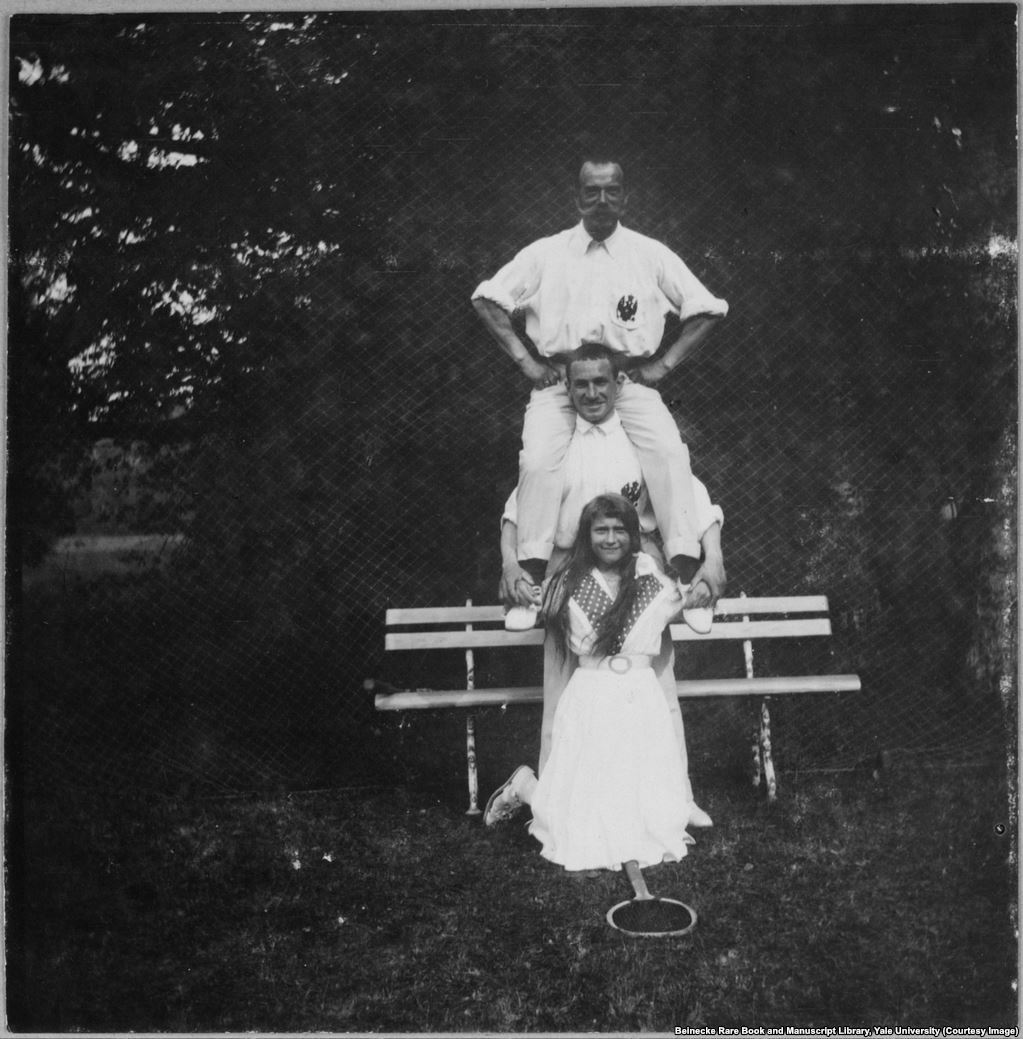 | Anastasia, the youngest of the Grand Duchesses, photographed after a round of tennis with an officer and her father, Nicholas II. On the night of the murders, on July 17, 1918, Anastasia fainted in the initial hail of bullets. She awoke moments later and screamed before the Bolshevik troops piled onto her with bayonets. |