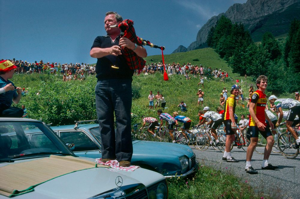 | A lone piper on the road to Alpe d’Huez. Two Belgian supporters in Raleigh colours await their team. |