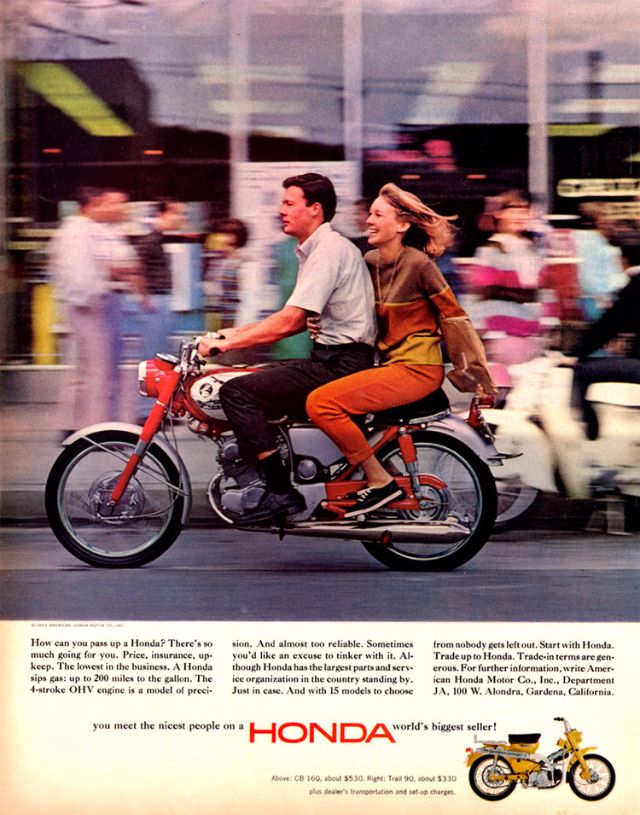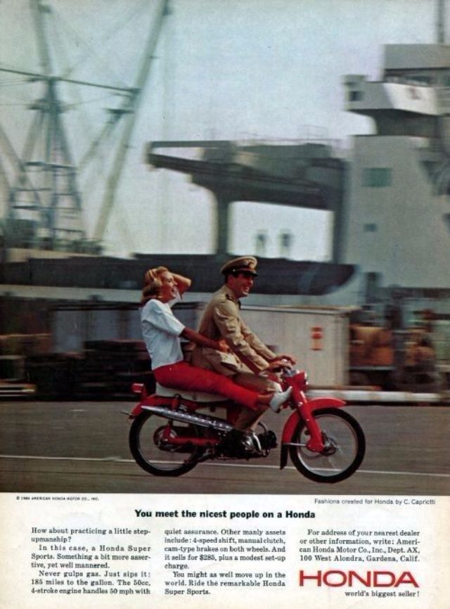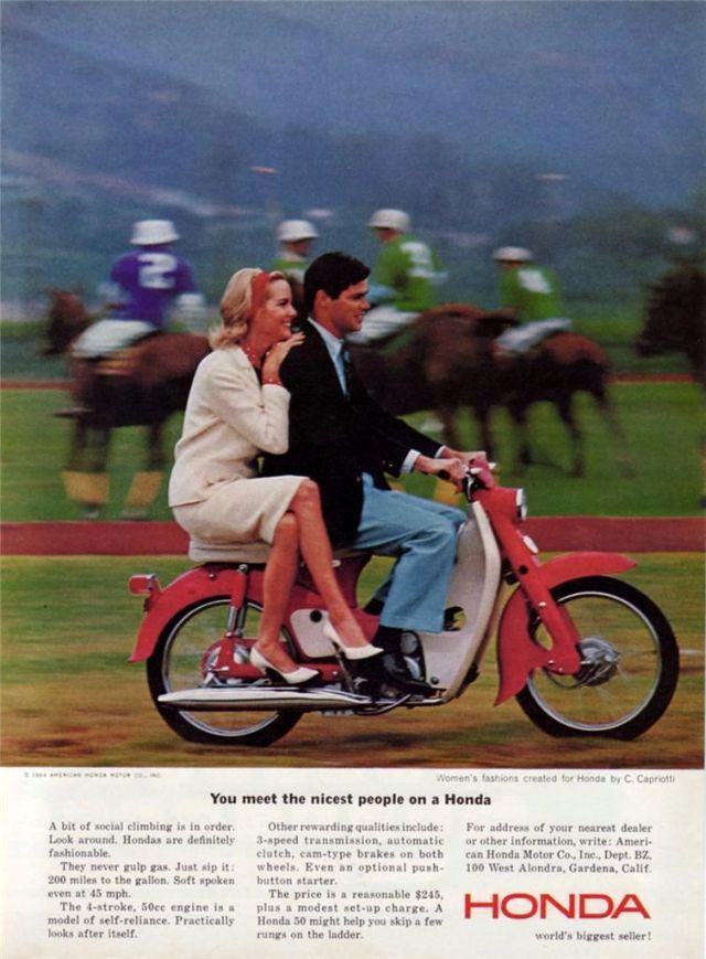 The ad depicted housewives, a parent and child, young couples and other respectable members of society - referred to as "the nicest people" - riding Honda 50s for a variety of purposes. Moreover, the colorful illustration and highly professional design appealed strongly to the public. Those who would otherwise have rolled their eyes at the word "motorcycle," and those who previously had no interest in them, soon saw in the motorcycle a new purpose: one of casual and convenient daily transportation.