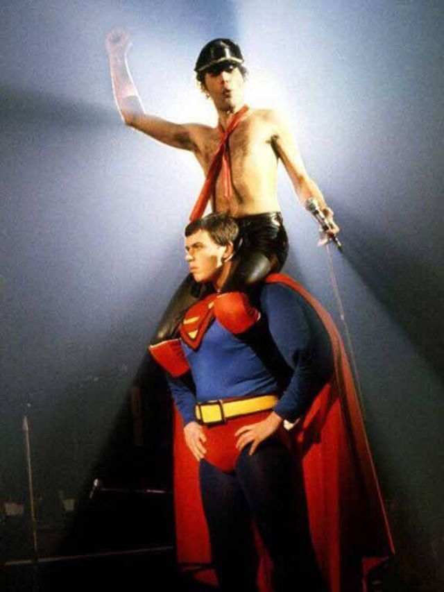 Freddie is being carried by "The Man of Steel" Superman while performing "We Will Rock You" in Queen concerts during Crazy Tour in November and December 1979.
