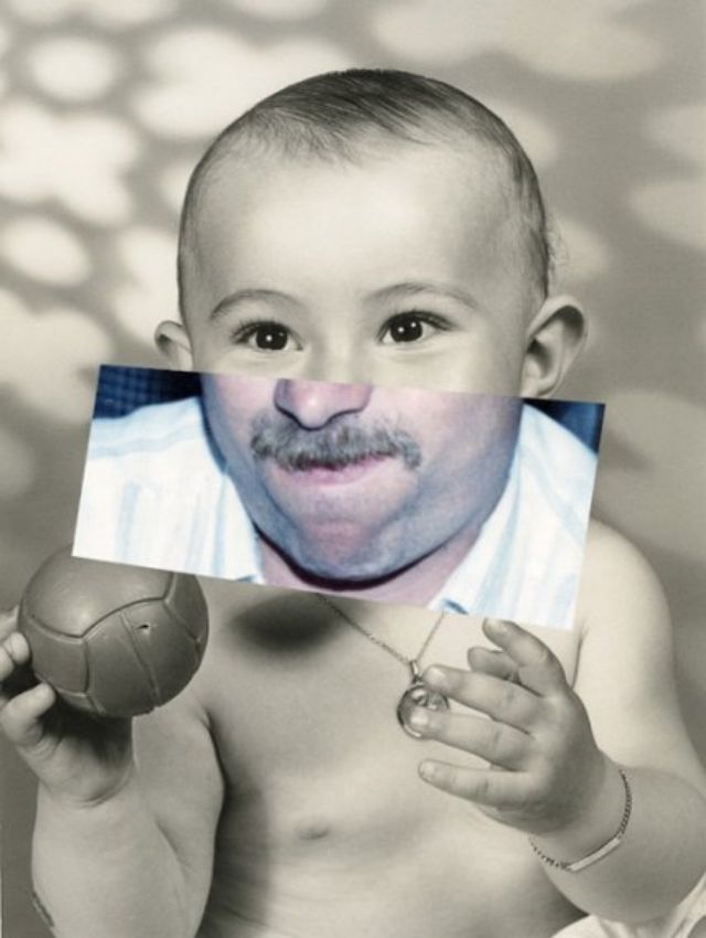 Beginning with vintage photos, French artist Benoit Luisiere creates unlikely pairings of old and new. In the series called Une promesse de papillon (A promised butterfly), he mixes mostly photos of babies with photos of toothless grandparents. And the results are very weird!