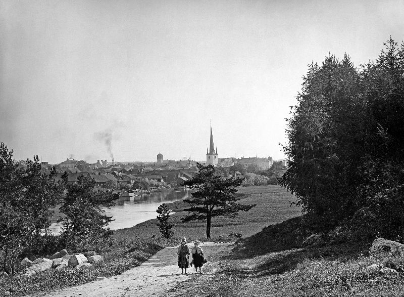 | Arboga. Two children on a road by the Arboga Stream. In the middle, the tower of the Holy Trintiy church, and left of it the tower of St. Nicolai church |