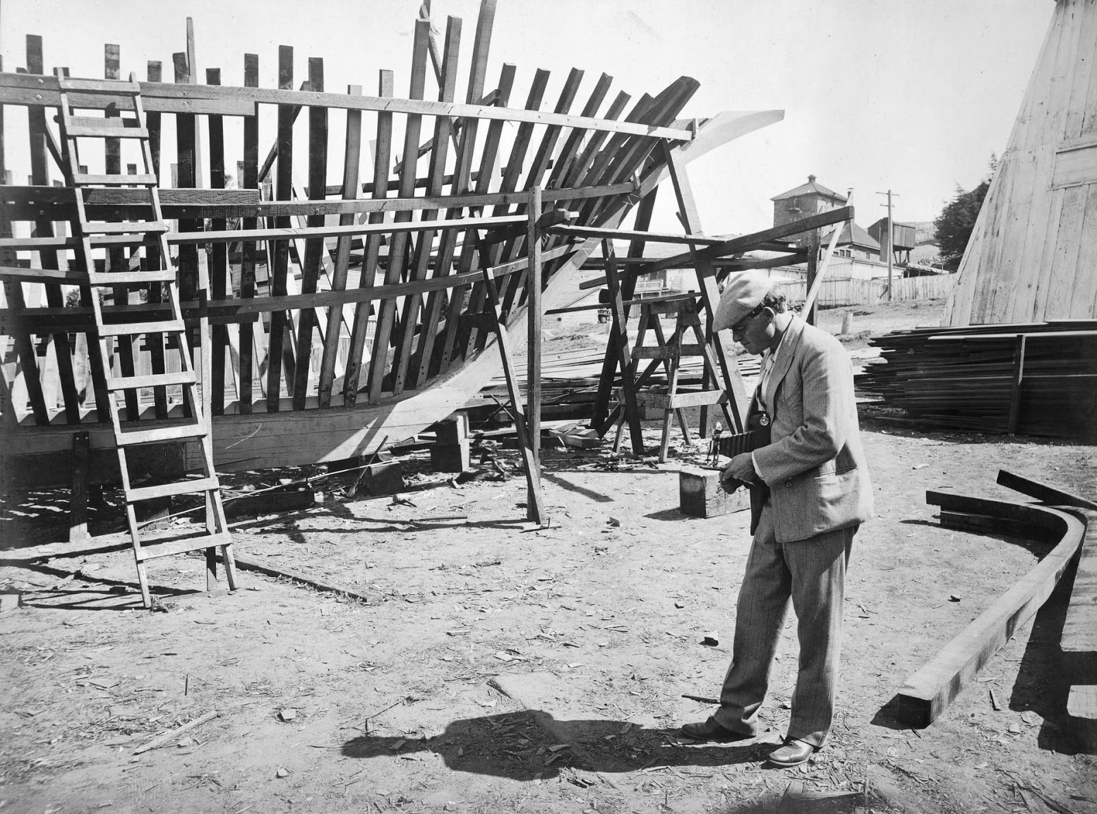 | Jack London photographing the skeleton of the Snark, in which he sailed across the south Pacific, in San Francisco Bay, 1906. |