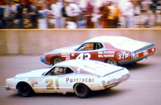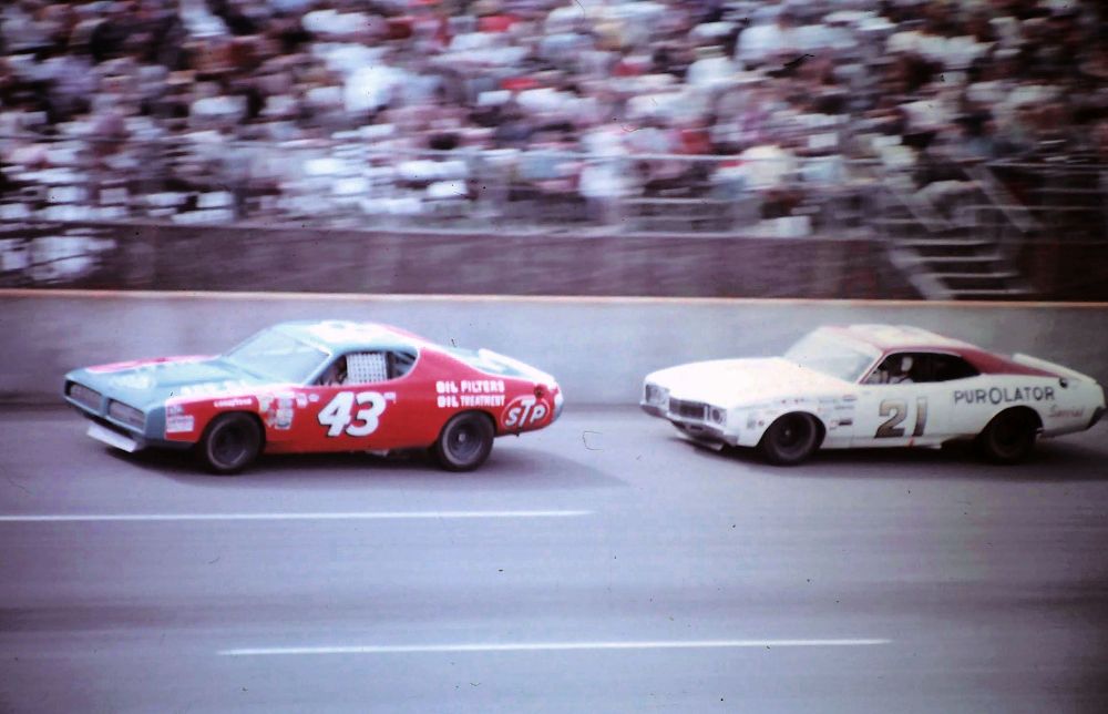 In the 1976 Daytona 500, Petty took the white flag in the lead, his No. 43 Petty Blue and Day-Glo Red Dodge ahead of the iconic No. 21 Wood Brothers Racing Mercury.