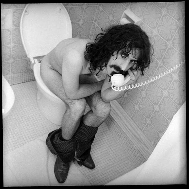 In the summer of 1967, nineteen year old photographer Robert Davidson was commissioned to shoot Frank Zappa in his London hotel room to promote an upcoming concert at the Royal Albert Hall. Upon arrival, Zappa met him at the door – wild-haired and scantily clad – and almost instantly retreated to the toilet. Robert seized the opportunity and asked through the ajar door if he could take his picture on the throne, there and then, at his most intimate.