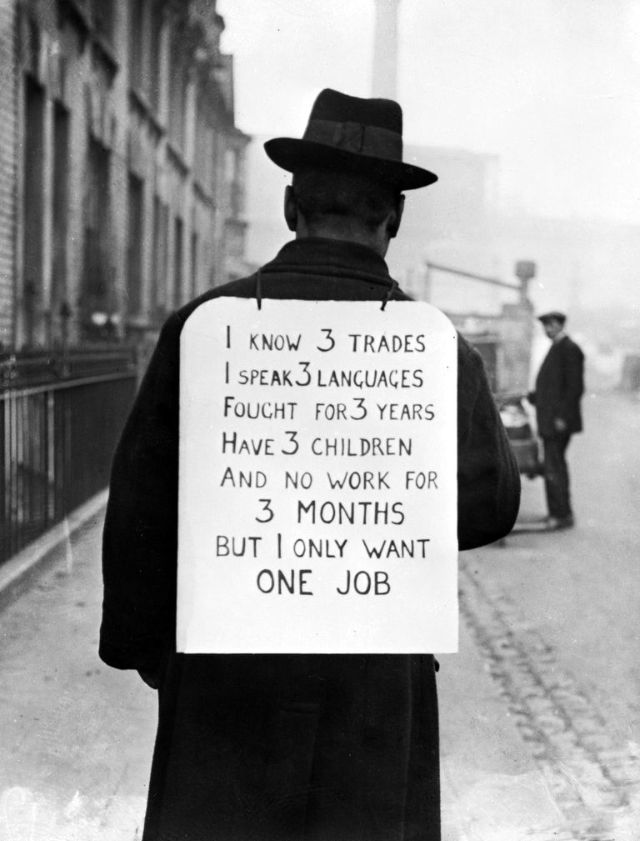People became so desperate for work. As men went from town to town, they were met with billboard signs telling them to keep going, because there was no work in the town. Men with families even got their children involved, carrying signs asking why no one would hire their dad. Then men started wearing their resume on cardboard placards that they wore as they walked along. It seemed incredulous to the men who had been in higher paid jobs, that they could no longer find work… even with their qualifications.