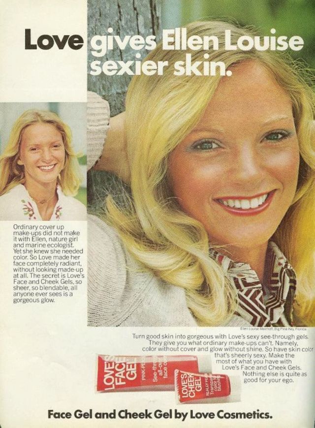 Loveshines was the fun stick to contour and color your eyes, face, all your other kissable little curves and hollows. Lipsticks were called Lovesticks. The remainder of the line was Love’s Basic Moisture, Love’s A Little Color, Love’s Transparent Powder, Love’s A Little Cover, Love’s Liner, Love’s Mascara, and Lovelids. The latter was an eyeshadow with a container in the shape of a plastic eyeball. The company believed that eyeshadows for the day should be in neutral shades, specifically taupe, russet, heather, or olive green. Nighttime was more suited for deeper, yet not brighter colors, especially purple, plum, or teal. In early 1976, Love Cosmetics started marketing Purple Sage, Tumbleweed, and Prairie Dawn eyeshadow shades.