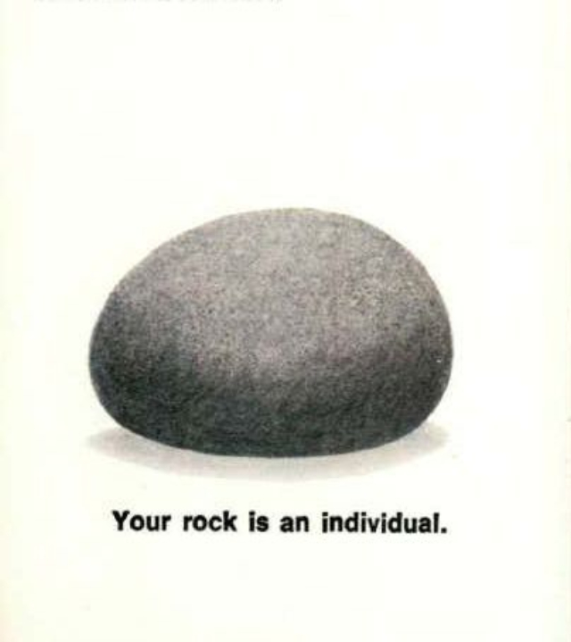 “Your PET ROCK will be a devoted friend and companion for many years to come,” stated Dahl’s booklet, which featured illustrations of the rocks in inaction. “Rocks enjoy a rather long life span so the two of you will never have to part –– at least not on your PET ROCK’s account. Once you have transcended the awkward training stage your rock will mature into a faithful, obedient, loving pet with but one purpose in life –– to be at your side when you want it to, and to go lie down when you don’t.”