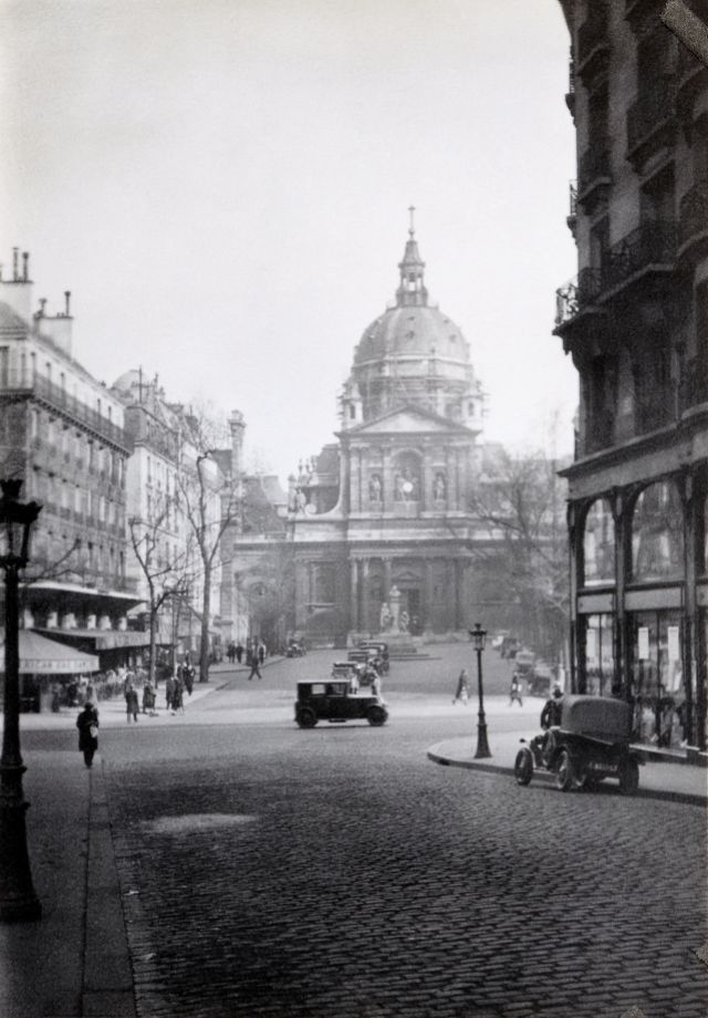 | Light traffic on Boulevard Saint-Michel, Paris, on a hazy winter's day in the 1920s. The words "Chapelle de la Sorbonne et Place de la Sorbonne, Paris 1929" are handwritten on reverse |