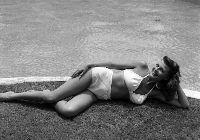Rita Hayworth posing in white two-piece bathing suit at her enormous swimming pool at home in 1945. This photo shoot was a day in the life of Rita at home with Orson Welles, Orson’s daughter, Christopher, new born Rebecca and Rita’s father, Eduardo. Rita’s mother had just passed away in January about 5 weeks after Rebecca was born.