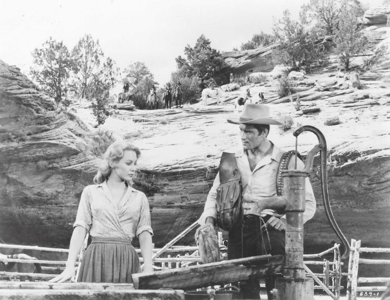 Known for its rugged outdoor cinematography and classic Western themes, Fort Dobbs reflects the genre’s 1950s popularity while highlighting frontier survival and courage. Take a look at these romantic photos capturing Clint Walker and Virginia Mayo together during the filming of Fort Dobbs in 1958.