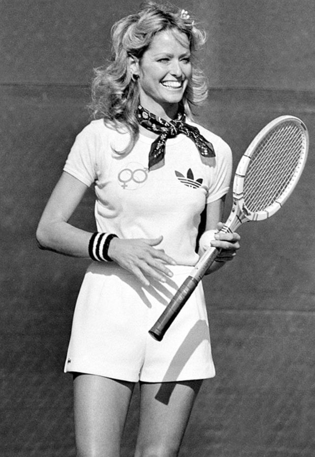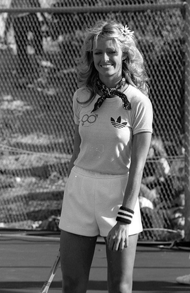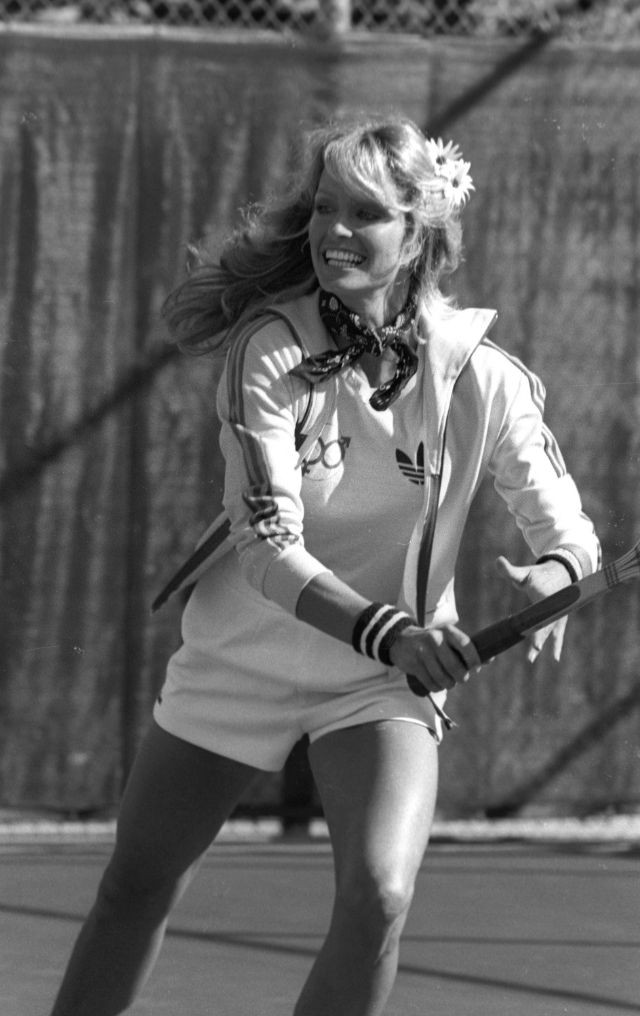Actress Farrah Fawcett attends the taping of “Celebrity Battle of the Sexes” tennis tournament on April 3, 1977 at Marguerite Park in Mission Viejo, California. She teams her tanned limbs and tomboy-ish Adidas shorts and T-shirt with a silk scarf for a touch of glamour.