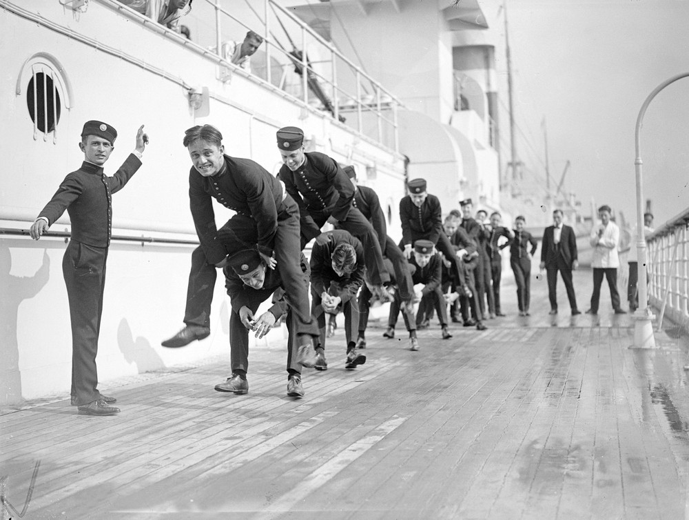 | Young bellhops playing leapfrog on the sun deck of US liner Leviathan (former Hamburg America line vessel Vaterland), on arrival at Southampton, 1923. (Photo by A. R. Coster) |