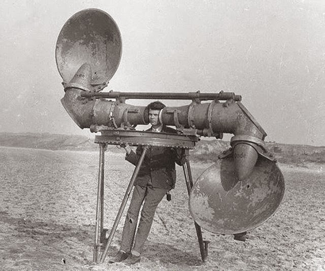 Before radar, troops used acoustic mirrors and listening devices like these to focus and detect the sound of engines from approaching aircraft.